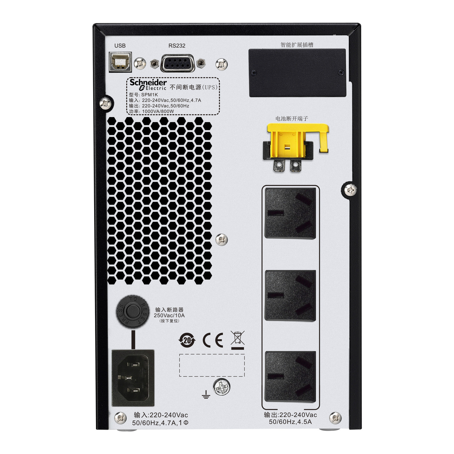 这是一款在线双变换式 UPS,额定功率为 1kVA。 它的额定电压为 220 V,塔式安装设计。 这款 UPS 可为小型应用提供可靠的电源保护,具有正弦波输出和高效率等特点。