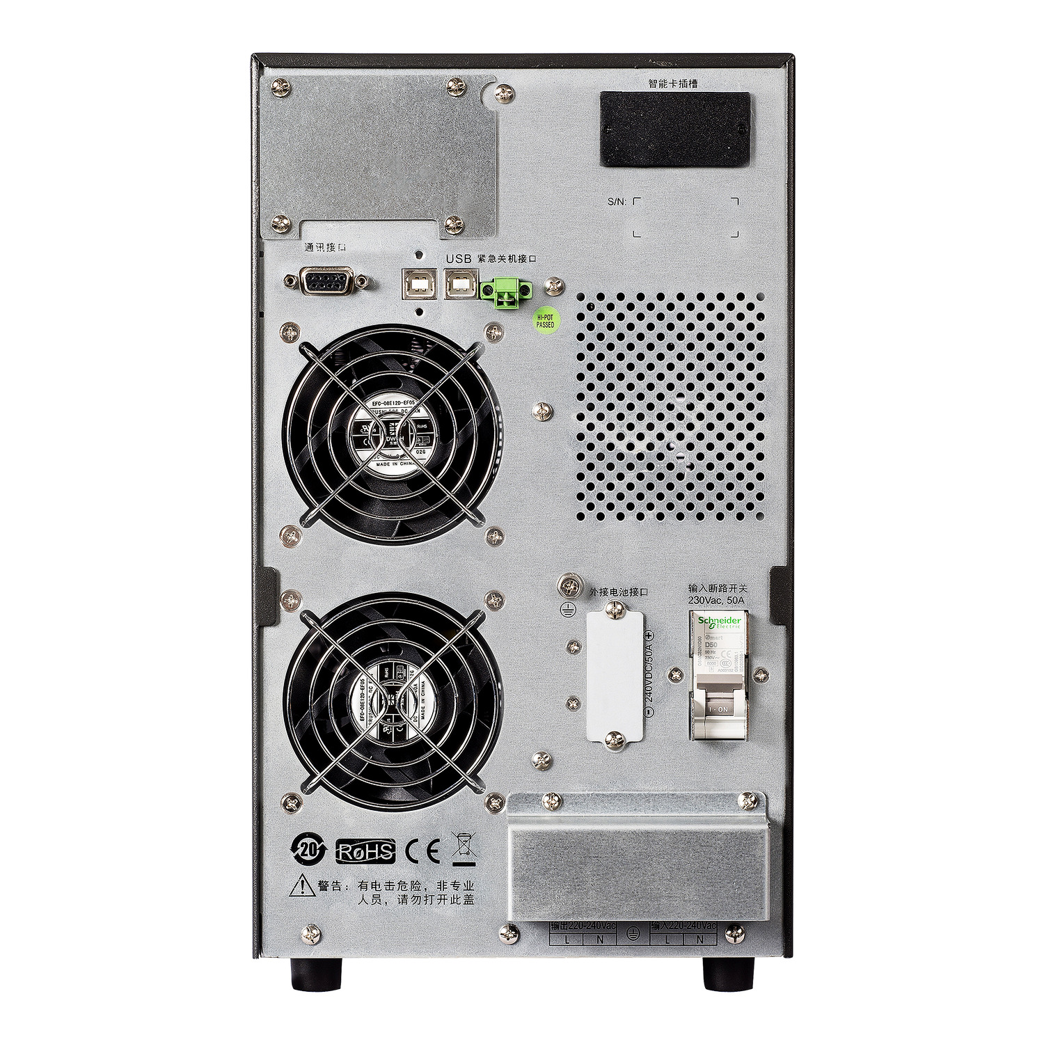 这是一款在线双变换式长延时 UPS,额定功率为 6kVA。 它的额定电压为 220 V,专为需要长后备运行时间的应用而设计。 UPS 具有正弦波输出和高效率等特点。